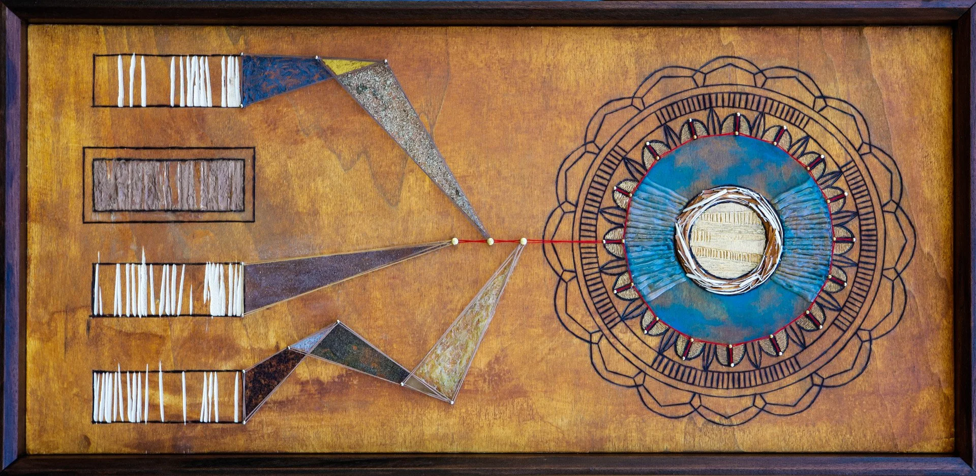 As One: The Continuance/ Thread, tea, brass, wood shavings, natural pigments, and acrylic on wood/ 12x24x3/ 2014